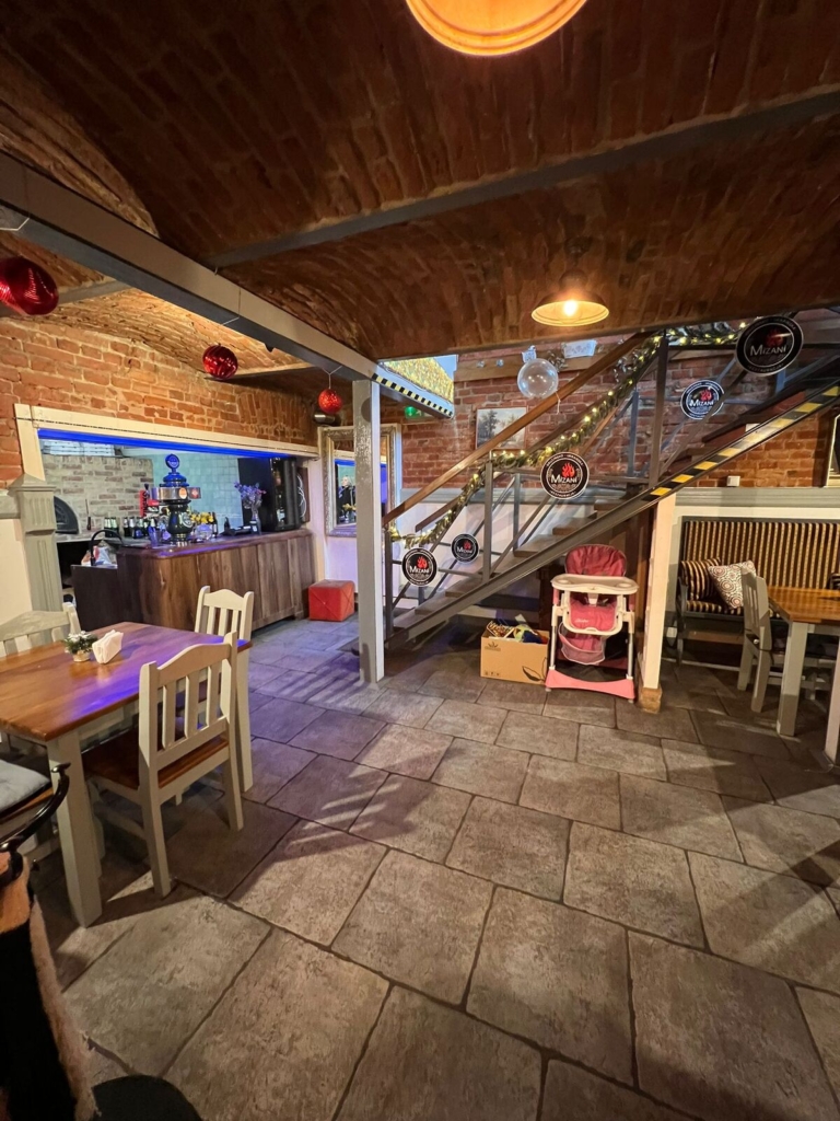 • wnętrze w stylu piwnicznym z ceglaną zabudową i sklepieniami