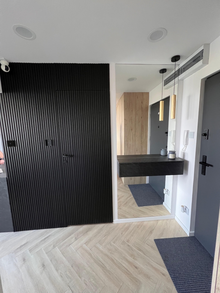 – nowe drzwi wewnętrzne DRE Sara Eco 2, bezprzylgowe, zlicowane ze ścianą, wykończone czarnymi lamelami