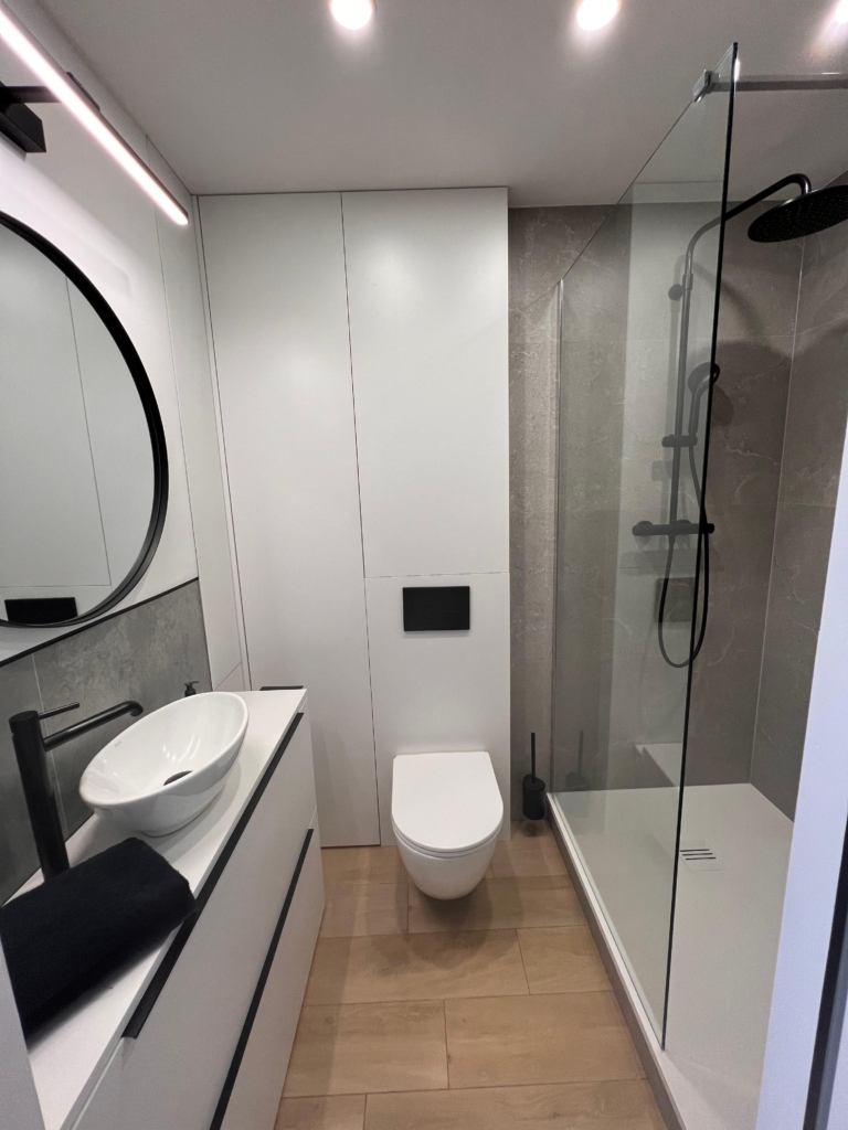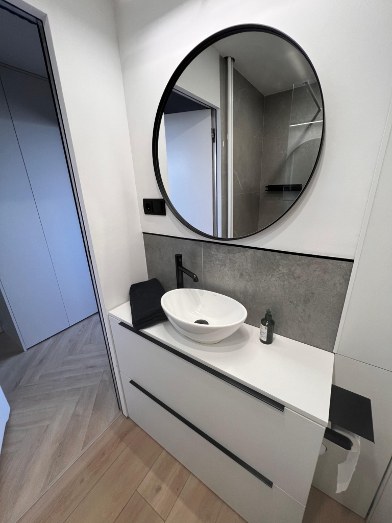 – zabudowa stolarska na wymiar z podświetlanymi drążkami w szafach (system tip-on)